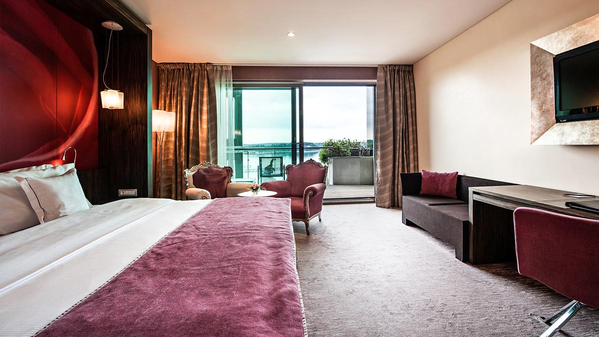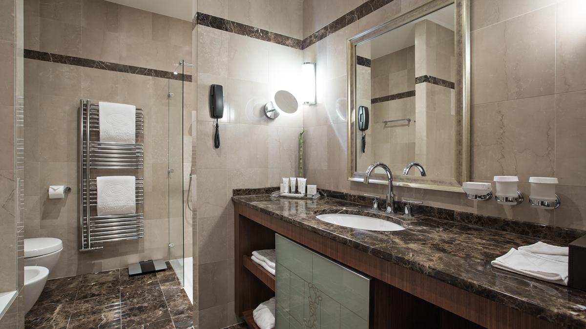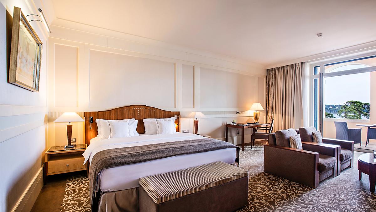 sobe su luksuzno opremljene, u klasičnom i modernom stilu. Ukusno uređene i klimatizovane sobe i apartmani tipa “suite” u ovom izvanrednom hotelu sa 5 zvezdica sadrže prostor za sedenje sa sofom, flat-screen TV sa kablovskim kanalima, mini-bar i sef. Kupatila u smeštajnim jedinicama opremljena su kadom, bideom, fenom za kosu i besplatnim toaletnim priborom. Pogodnosti uključuju bade-mantile i papuče. Sve smeštajne jedinice imaju standardan ili francuski balkon sa pogledom na Jadransko more ili na park.